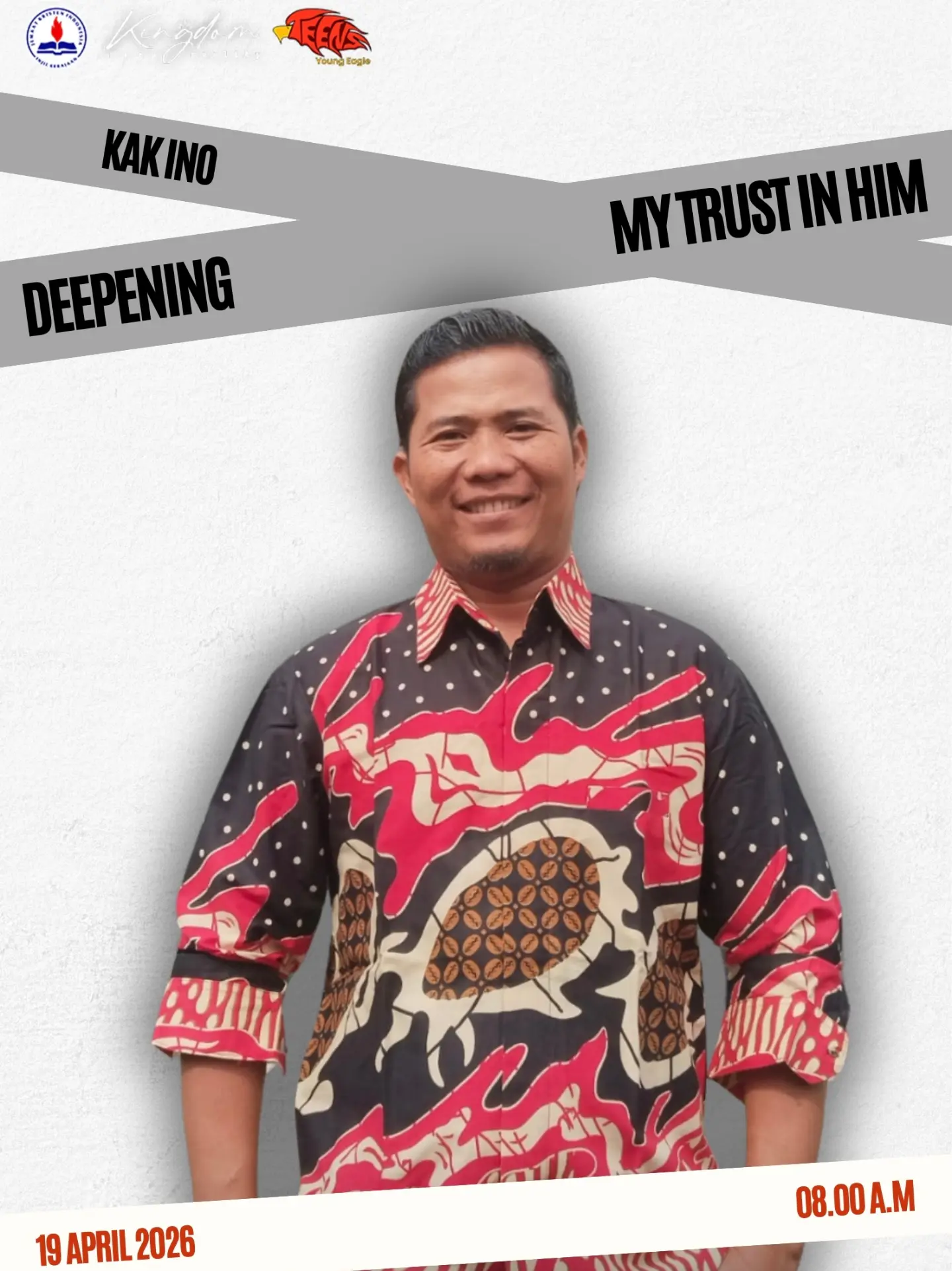 SHALOM YOUNG EAGLES π¦ Start your Sunday the right way! Yuk datang dan refresh hati, pikiran, dan imanmu di Teens Service minggu ini! " DEEPENING MY TRUST IN HIM" βπ»π Deepening bukan tentang seberapa cepat kita sampai, tapi seberapa dalam kita percaya. βMy trust in Himβ bukan cuma kata, tapi keputusan setiap hari β¨ π€ Speaker : Kak Ino ποΈ Minggu, 19 April 2026 π Kapel Jubilee, JKI Injil Kerajaan β° 08.00 a.m π₯ Don't miss it, Young Eagles! See you there! π¦ #teensservice #jkiinjilkerajaansemarang #sundayservice #remajakristen #blessed".